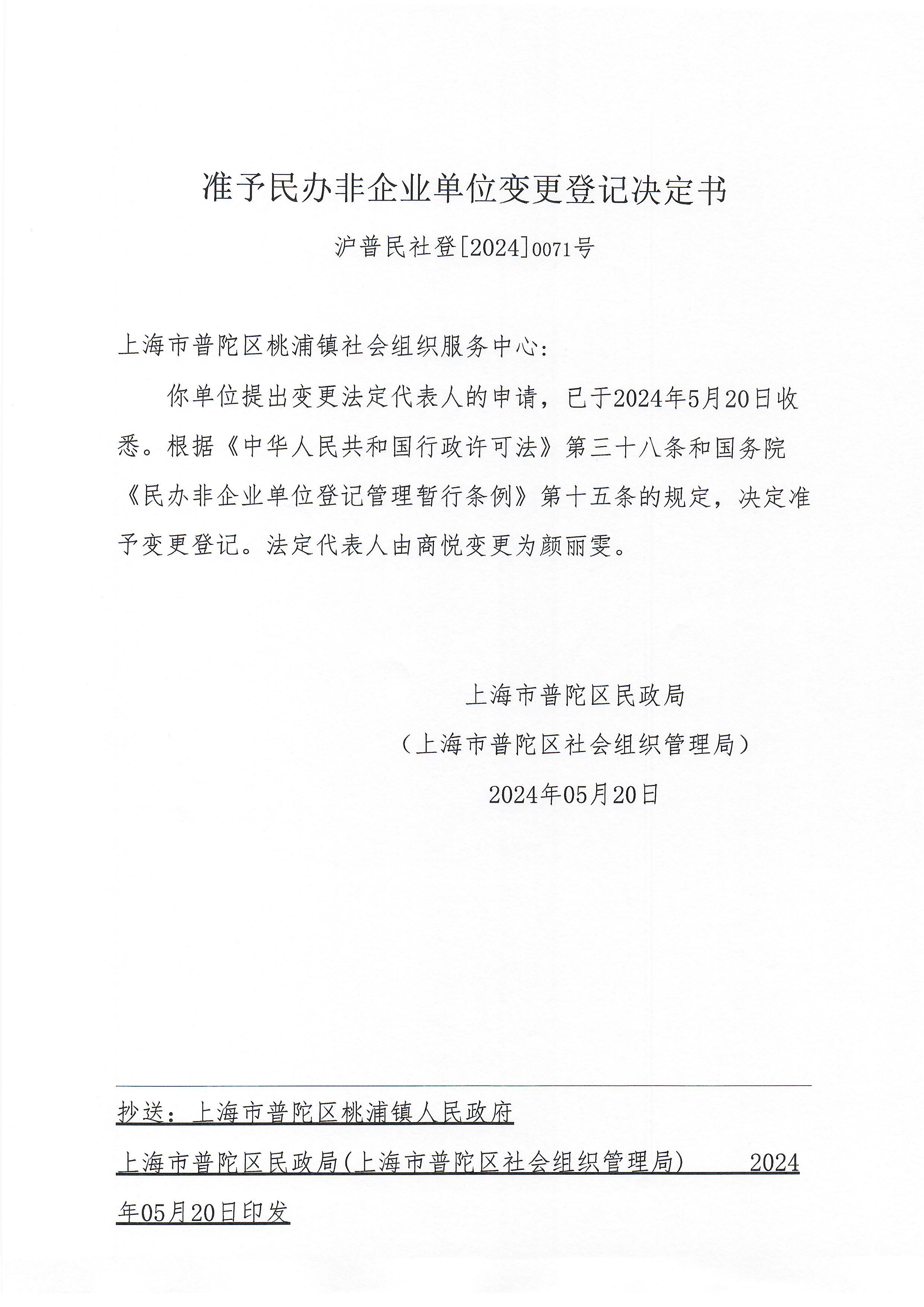 你单位提出变更法定代表人的申请,已于2024年5月20日收悉。根据《中华人民共和国行政许可法》第三十八条和国务院《民办非企业单位登记管理暂行条例》第十五条的规定,决定准予变更登记。法定代表人由商悦变更为颜丽雯。