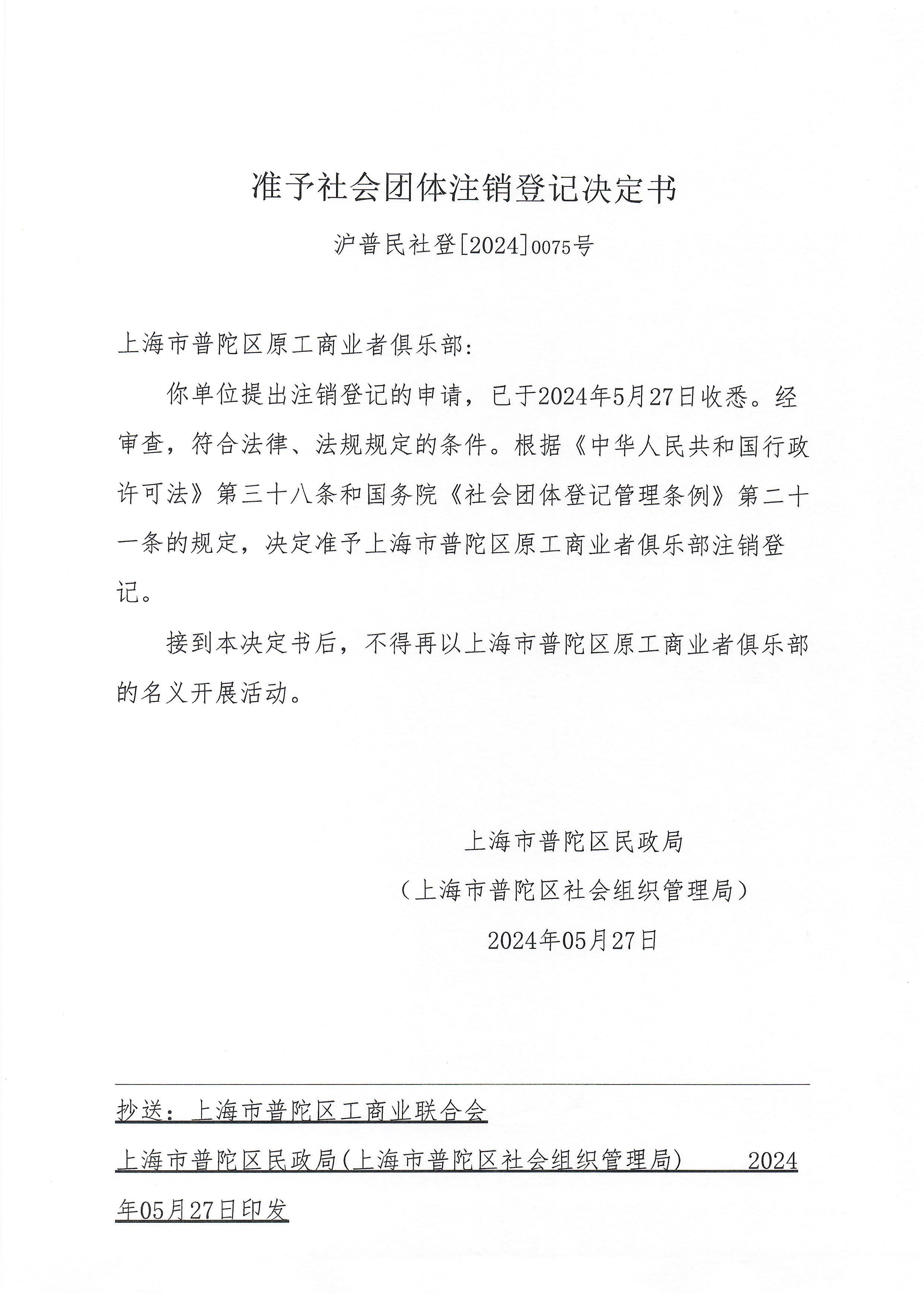 你单位提出注销登记的申请,已于2024年5月27日收悉。经审查,符合法律、法规规定的条件。根据《中华人民共和国行政许可法》第三十八条和国务院《社会团体登记管理条例》第二十一条的规定,决定准予上海市普陀区原工商业者俱乐部注销登记。