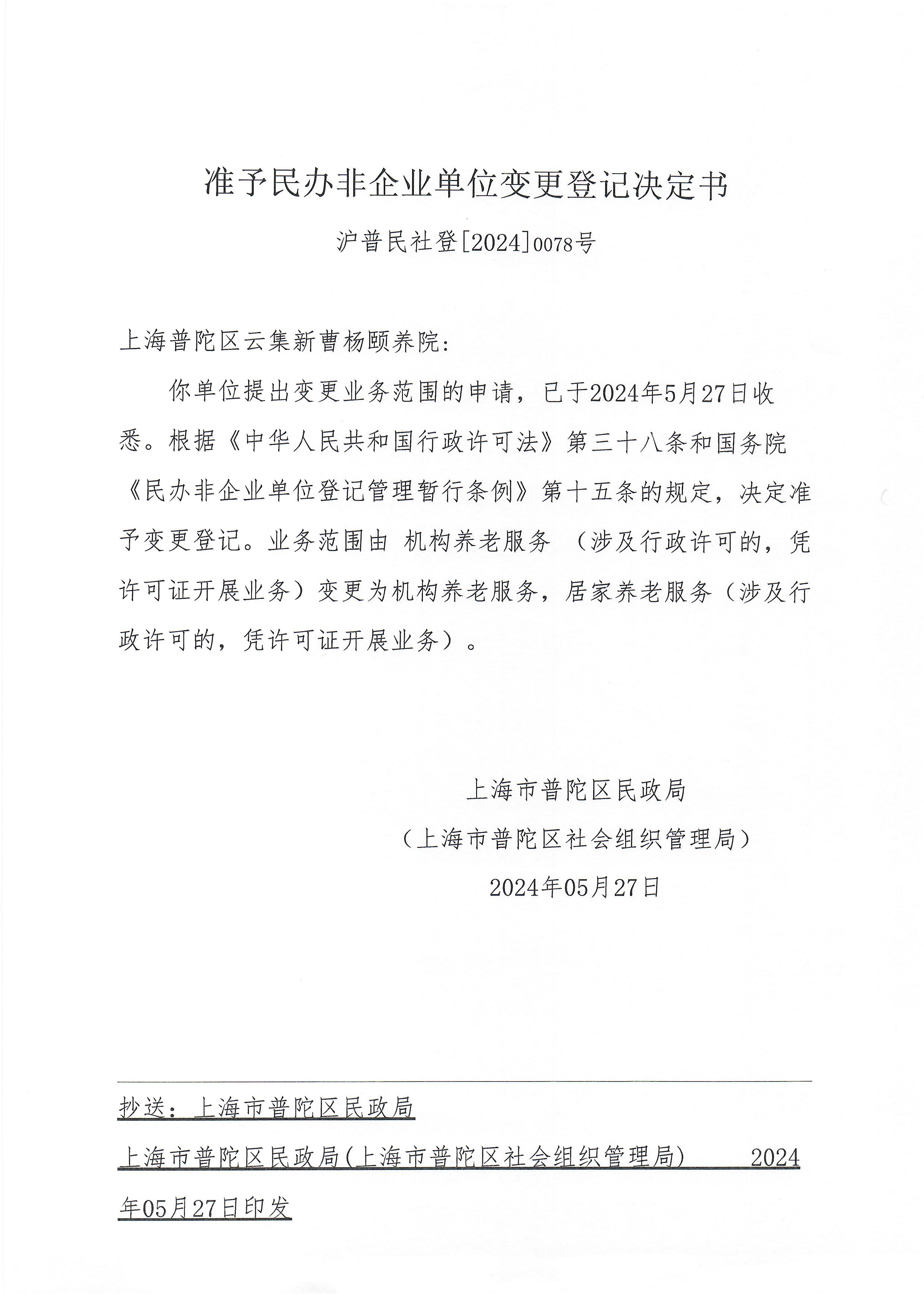 你单位提出变更业务范围的申请,已于2024年5月27日收悉。根据《中华人民共和国行政许可法》第三十八条和国务院《民办非企业单位登记管理暂行条例》第十五条的规定,决定准予变更登记。业务范围由 机构养老服务 (涉及行政许可的,凭许可证开展业务)变更为机构养老服务,居家养老服务(涉及行政许可的,凭许可证开展业务)。