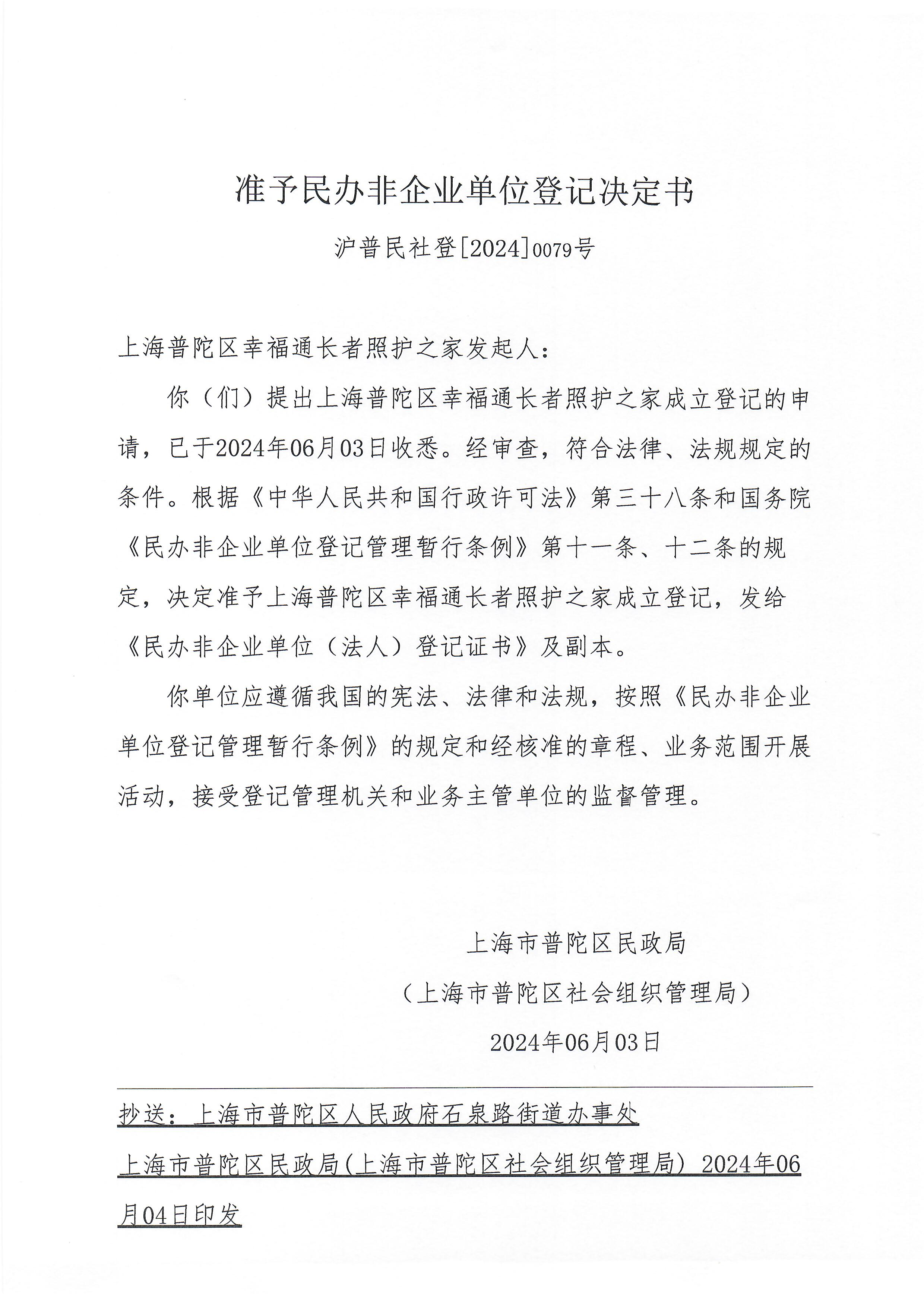 你(们)提出上海普陀区幸福通长者照护之家成立登记的申请,已于2024年06月03日收悉。经审查,符合法律、法规规定的条件。根据《中华人民共和国行政许可法》第三十八条和国务院《民办非企业单位登记管理暂行条例》第十一条、十二条的规定,决定准予上海普陀区幸福通长者照护之家成立登记,发给《民办非企业单位(法人)登记证书》及副本。