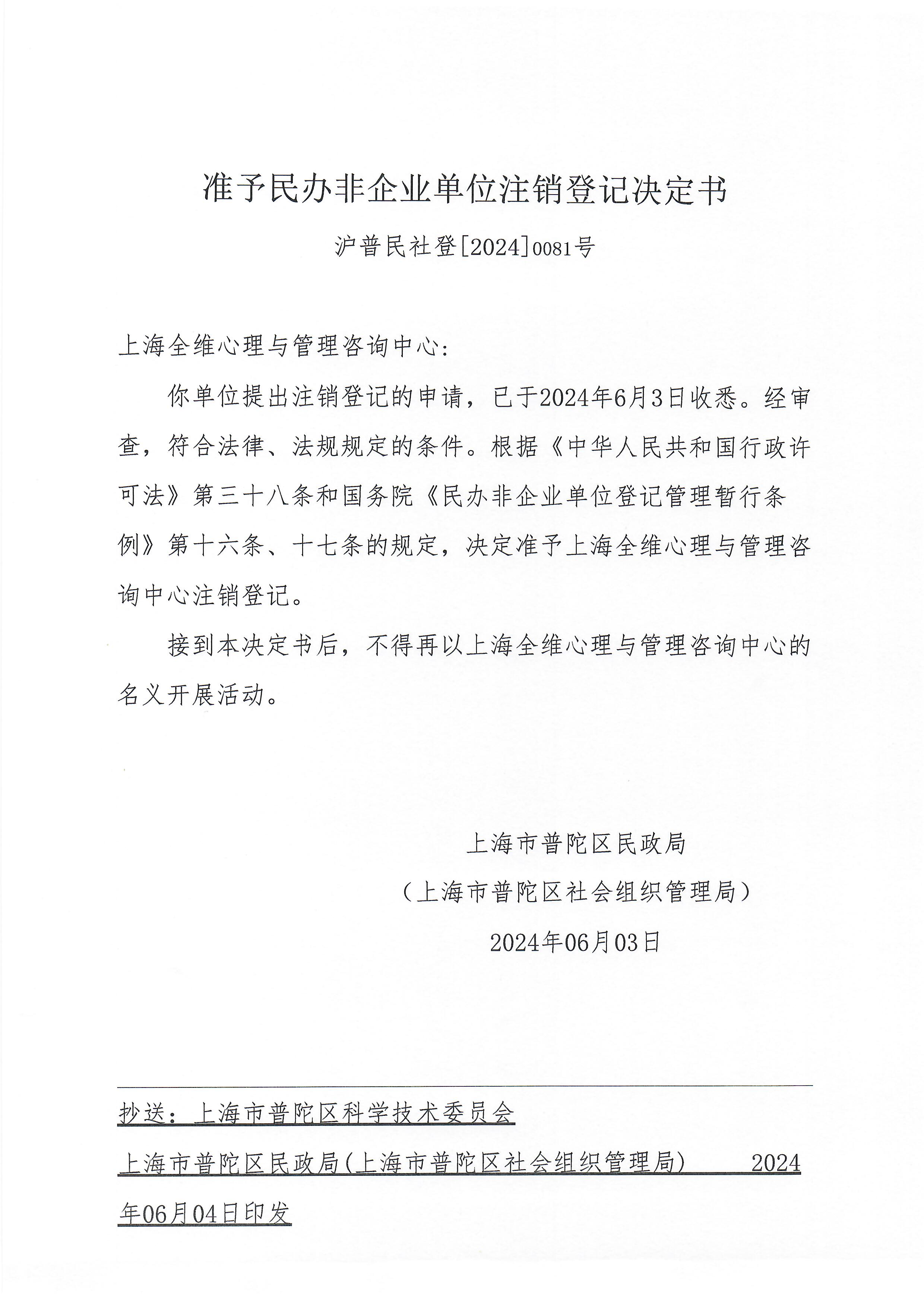 你单位提出注销登记的申请,已于2024年6月3日收悉。经审查,符合法律、法规规定的条件。根据《中华人民共和国行政许可法》第三十八条和国务院《民办非企业单位登记管理暂行条例》第十六条、十七条的规定,决定准予上海全维心理与管理咨询中心注销登记。