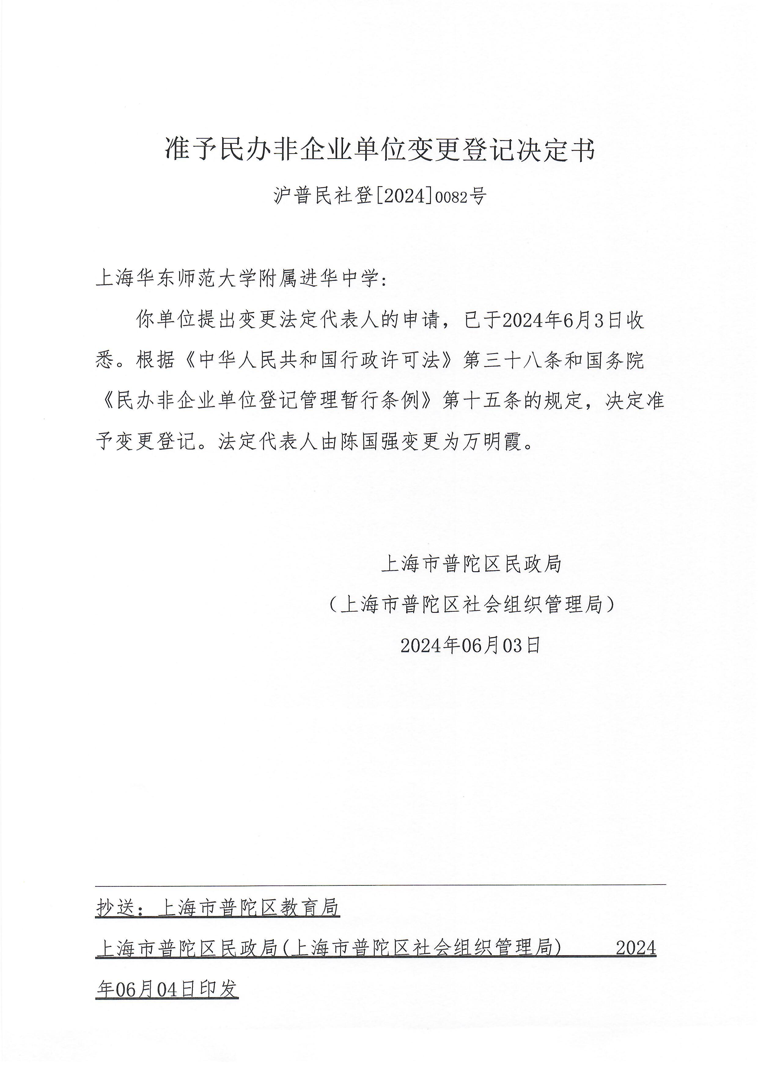 你单位提出变更法定代表人的申请,已于2024年6月3日收悉。根据《中华人民共和国行政许可法》第三十八条和国务院《民办非企业单位登记管理暂行条例》第十五条的规定,决定准予变更登记。法定代表人由陈国强变更为万明霞。
