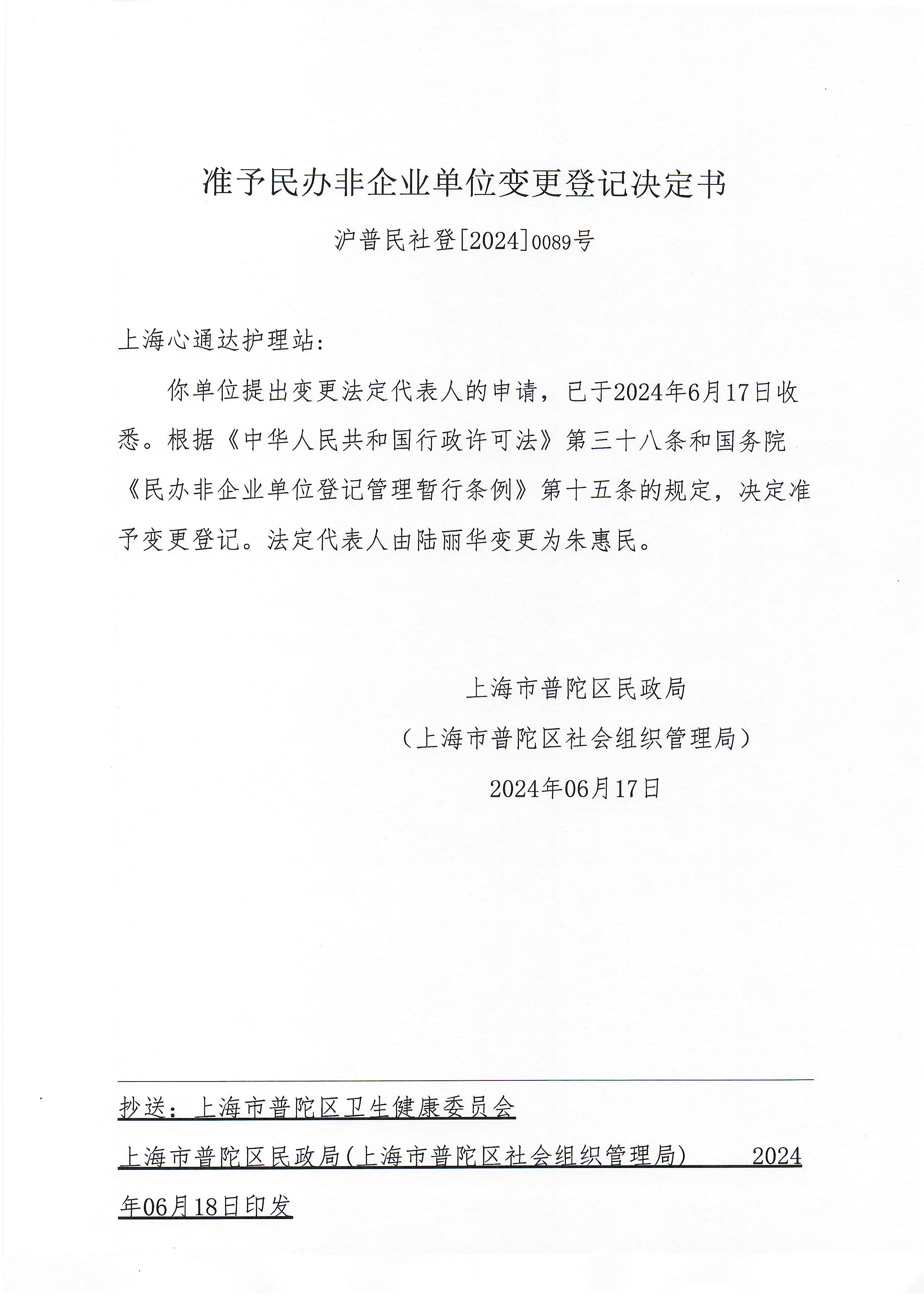 你单位提出变更法定代表人的申请,已于2024年6月17日收悉。根据《中华人民共和国行政许可法》第三十八条和国务院《民办非企业单位登记管理暂行条例》第十五条的规定,决定准予变更登记。法定代表人由陆丽华变更为朱惠民。