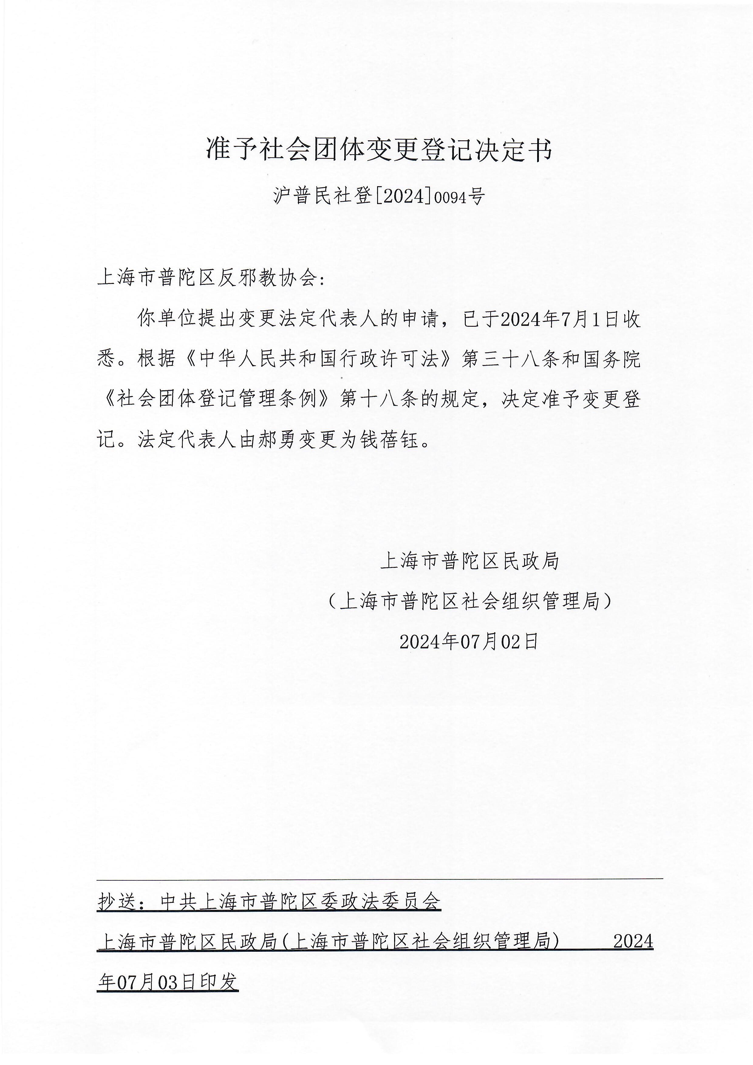 你单位提出变更法定代表人的申请,已于2024年7月1日收悉。根据《中华人民共和国行政许可法》第三十八条和国务院《社会团体登记管理条例》第十八条的规定,决定准予变更登记。法定代表人由郝勇变更为钱蓓钰。