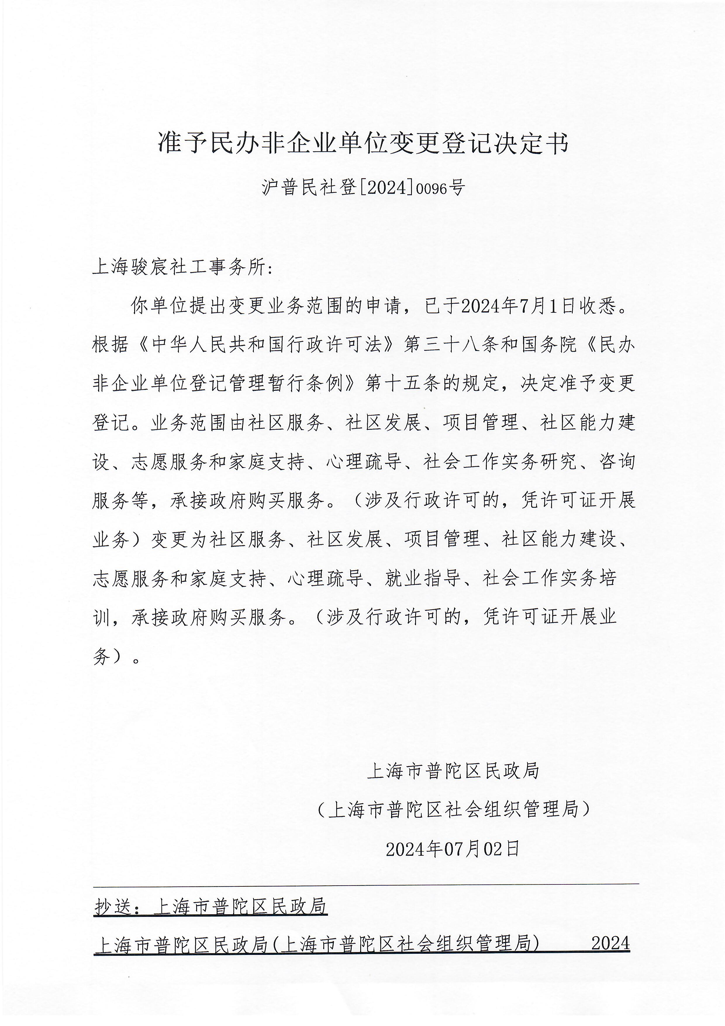 你单位提出变更业务范围的申请,已于2024年7月1日收悉。根据《中华人民共和国行政许可法》第三十八条和国务院《民办非企业单位登记管理暂行条例》第十五条的规定,决定准予变更登记。业务范围由社区服务、社区发展、项目管理、社区能力建设、志愿服务和家庭支持、心理疏导、社会工作实务研究、咨询服务等,承接政府购买服务。(涉及行政许可的,凭许可证开展业务)变更为社区服务、社区发展、项目管理、社区能力建设、志愿服务和家庭支持、心理疏导、就业指导、社会工作实务培训,承接政府购买服务。(涉及行政许可的,凭许可证开展业务)。