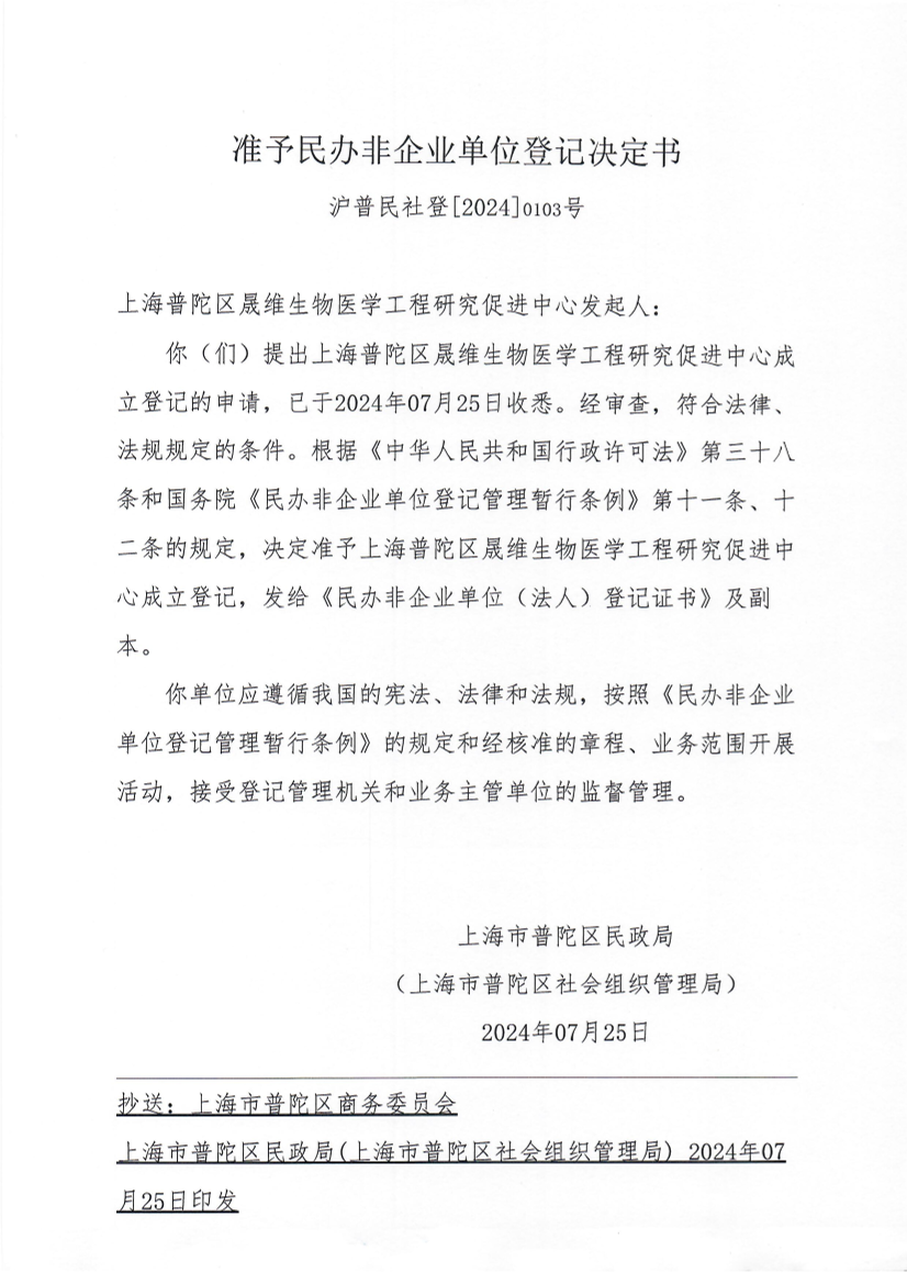 你(们)提出上海普陀区晟维生物医学工程研究促进中心成立登记的申请,已于2024年07月25日收悉。经审查,符合法律、法规规定的条件。根据《中华人民共和国行政许可法》第三十八条和国务院《民办非企业单位登记管理暂行条例》第十一条、十二条的规定,决定准予上海普陀区晟维生物医学工程研究促进中心成立登记,发给《民办非企业单位(法人)登记证书》及副本。