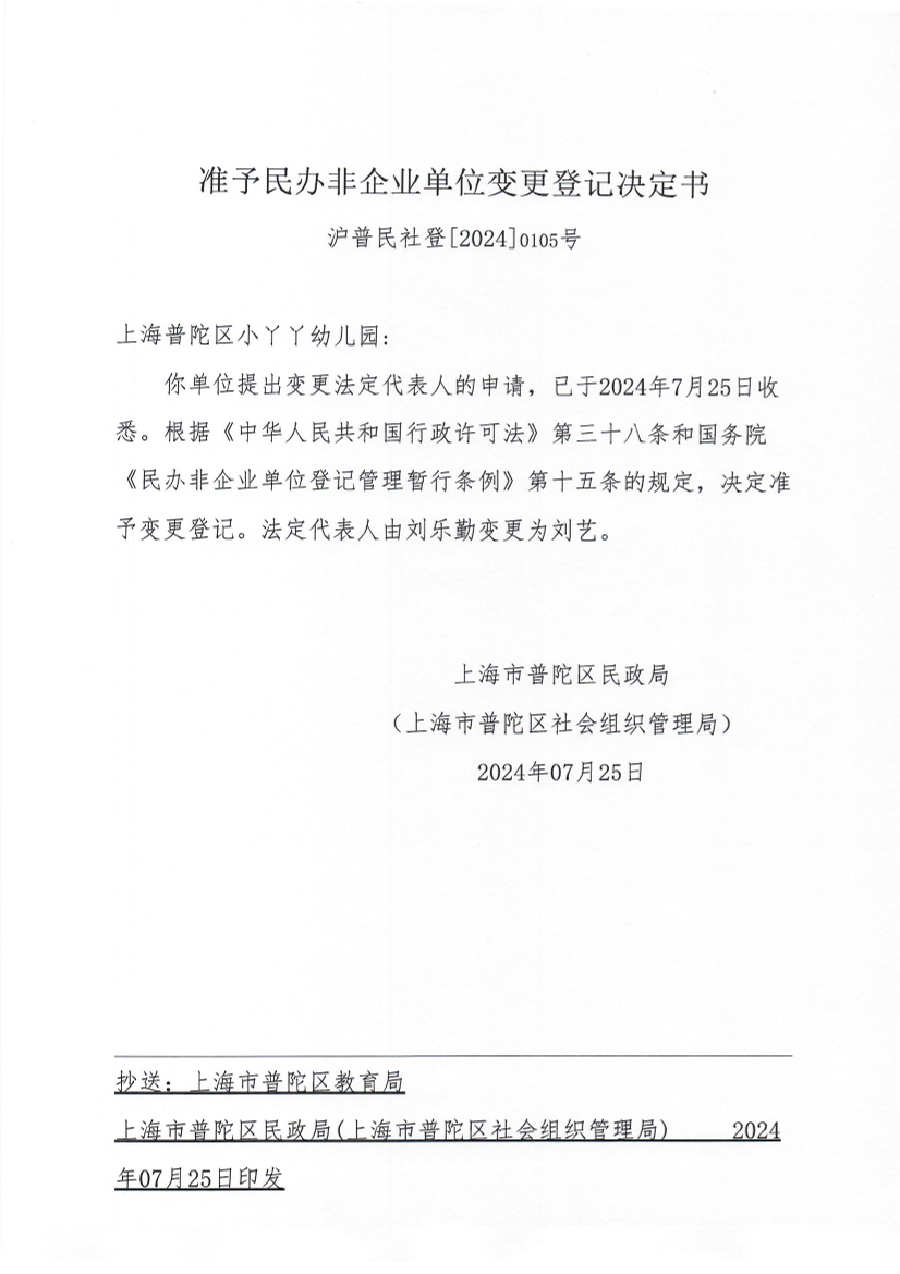 你单位提出变更法定代表人的申请,已于2024年7月25日收悉。根据《中华人民共和国行政许可法》第三十八条和国务院《民办非企业单位登记管理暂行条例》第十五条的规定,决定准予变更登记。法定代表人由刘乐勤变更为刘艺。
