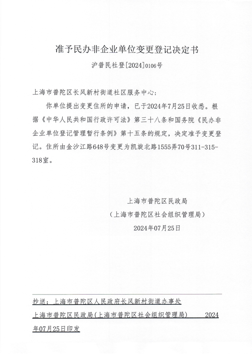 你单位提出变更住所的申请,已于2024年7月25日收悉。根据《中华人民共和国行政许可法》第三十八条和国务院《民办非企业单位登记管理暂行条例》第十五条的规定,决定准予变更登记。住所由金沙江路648号变更为凯旋北路1555弄70号311-315-318室。