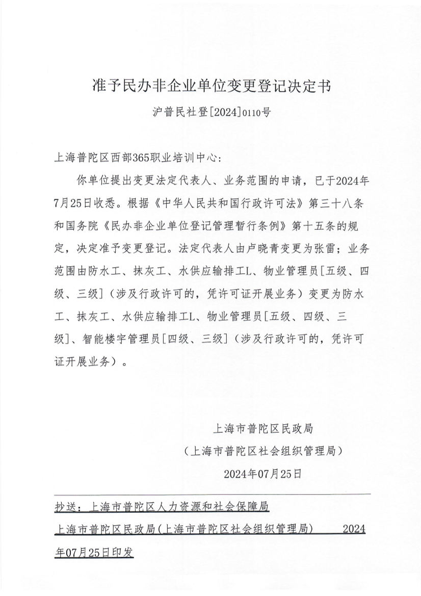 你单位提出变更法定代表人、业务范围的申请,已于2024年7月25日收悉。根据《中华人民共和国行政许可法》第三十八条和国务院《民办非企业单位登记管理暂行条例》第十五条的规定,决定准予变更登记。法定代表人由卢晓青变更为张雷;业务范围由防水工、抹灰工、水供应输排工L、物业管理员[五级、四级、三级](涉及行政许可的,凭许可证开展业务)变更为防水工、抹灰工、水供应输排工L、物业管理员[五级、四级、三级]、智能楼宇管理员[四级、三级](涉及行政许可的,凭许可证开展业务)。