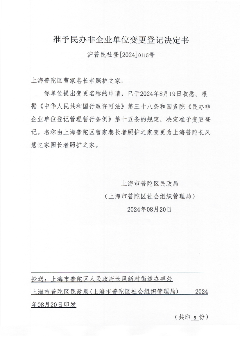你单位提出变更名称的申请,已于2024年8月19日收悉。根据《中华人民共和国行政许可法》第三十八条和国务院《民办非企业单位登记管理暂行条例》第十五条的规定,决定准予变更登记。名称由上海普陀区曹家巷长者照护之家变更为上海普陀长风慧忆家园长者照护之家。