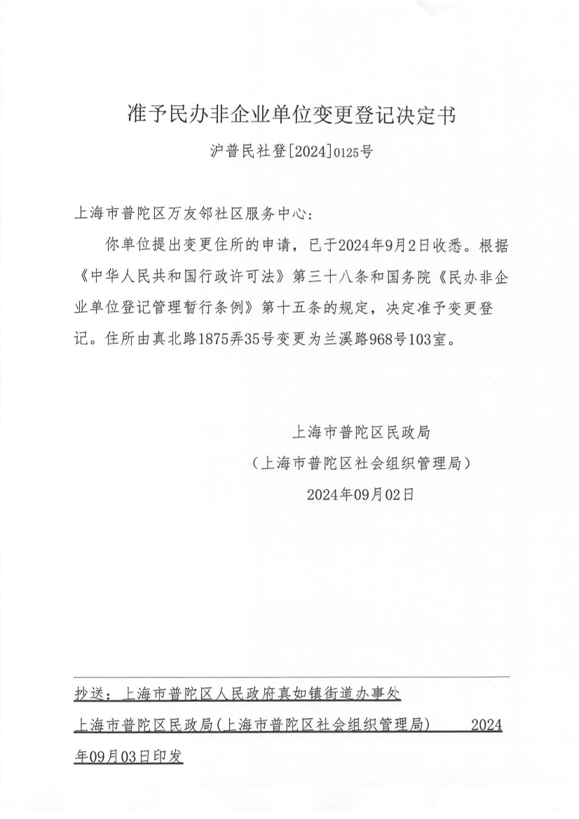 你单位提出变更住所的申请,已于2024年9月2日收悉。根据《中华人民共和国行政许可法》第三十八条和国务院《民办非企业单位登记管理暂行条例》第十五条的规定,决定准予变更登记。住所由真北路1875弄35号变更为兰溪路968号103室。