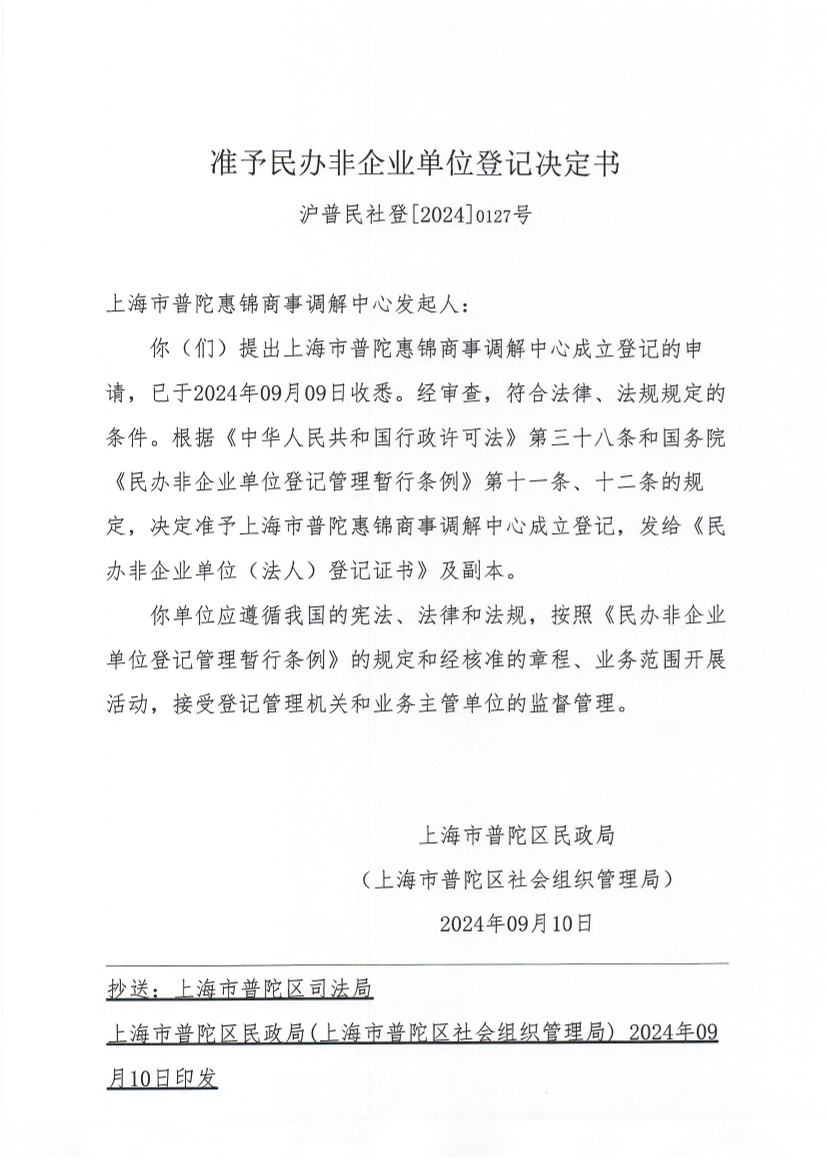 你(们)提出上海市普陀惠锦商事调解中心成立登记的申请,已于2024年09月09日收悉。经审查,符合法律、法规规定的条件。根据《中华人民共和国行政许可法》第三十八条和国务院《民办非企业单位登记管理暂行条例》第十一条、十二条的规定,决定准予上海市普陀惠锦商事调解中心成立登记,发给《民办非企业单位(法人)登记证书》及副本。