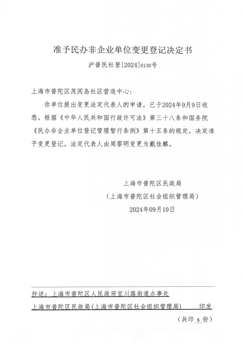 你单位提出变更法定代表人的申请,已于2024年9月9日收悉。根据《中华人民共和国行政许可法》第三十八条和国务院《民办非企业单位登记管理暂行条例》第十五条的规定,决定准予变更登记。法定代表人由周黎明变更为戴佳麒。