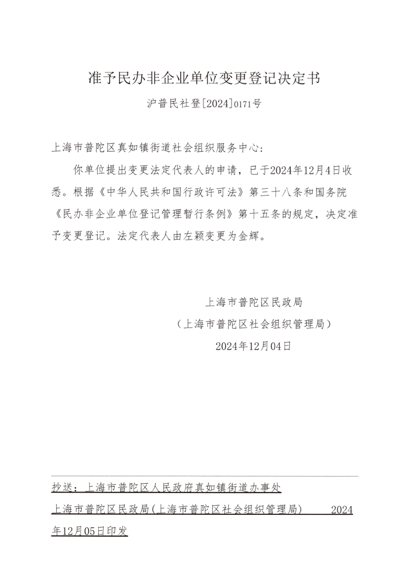 你单位提出变更法定代表人的申请,已于2024年12月4日收悉。根据《中华人民共和国行政许可法》第三十八条和国务院《民办非企业单位登记管理暂行条例》第十五条的规定,决定准予变更登记。法定代表人由左颖变更为金辉。