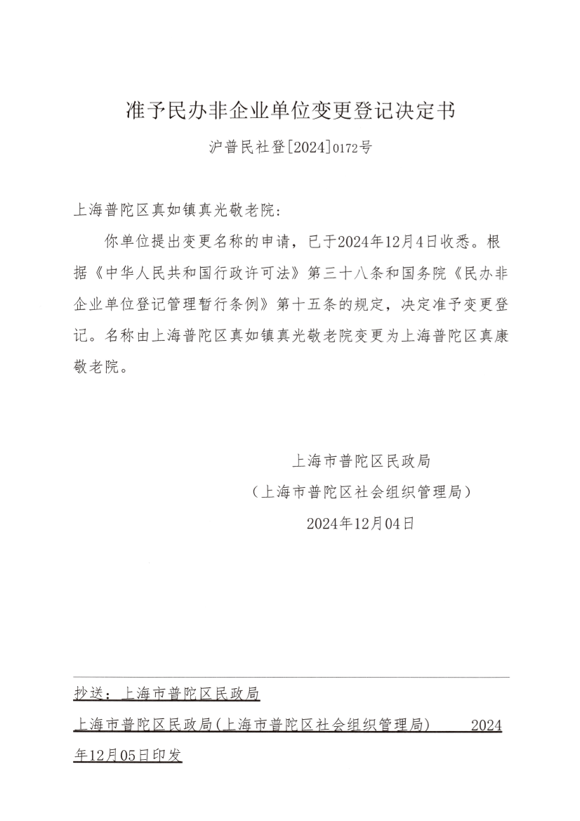 你单位提出变更名称的申请,已于2024年12月4日收悉。根据《中华人民共和国行政许可法》第三十八条和国务院《民办非企业单位登记管理暂行条例》第十五条的规定,决定准予变更登记。名称由上海普陀区真如镇真光敬老院变更为上海普陀区真康敬老院。