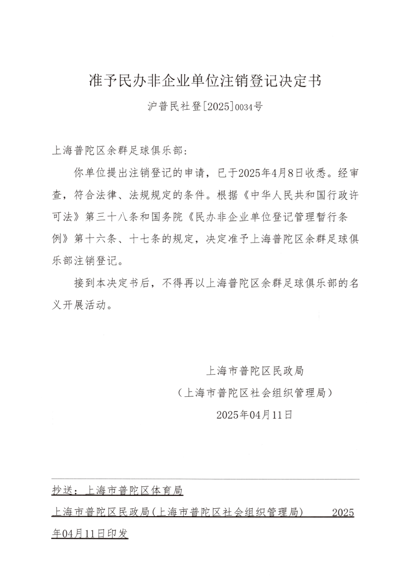 你单位提出注销登记的申请,已于2025年4月8日收悉。经审查,符合法律、法规规定的条件。根据《中华人民共和国行政许可法》第三十八条和国务院《民办非企业单位登记管理暂行条例》第十六条、十七条的规定,决定准予上海普陀区余群足球俱乐部注销登记。