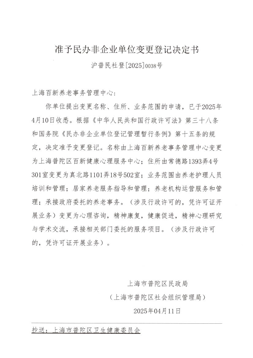 你单位提出变更名称、住所、业务范围的申请,已于2025年4月10日收悉。根据《中华人民共和国行政许可法》第三十八条和国务院《民办非企业单位登记管理暂行条例》第十五条的规定,决定准予变更登记。名称由上海百新养老事务管理中心变更为上海普陀区百新健康心理服务中心;住所由常德路1393弄4号301室变更为真北路1101弄18号502室;业务范围由养老护理人员培训和管理;居家养老服务指导和管理;养老机构运营服务和管理;承接政府委托的养老事务。(涉及行政许可的,凭许可证开展业务)变更为心理咨询,精神康复,健康促进,精神心理研究与学术交流,承接相关部门委托的服务项目。(涉及行政许可的,凭许可证开展业务)。