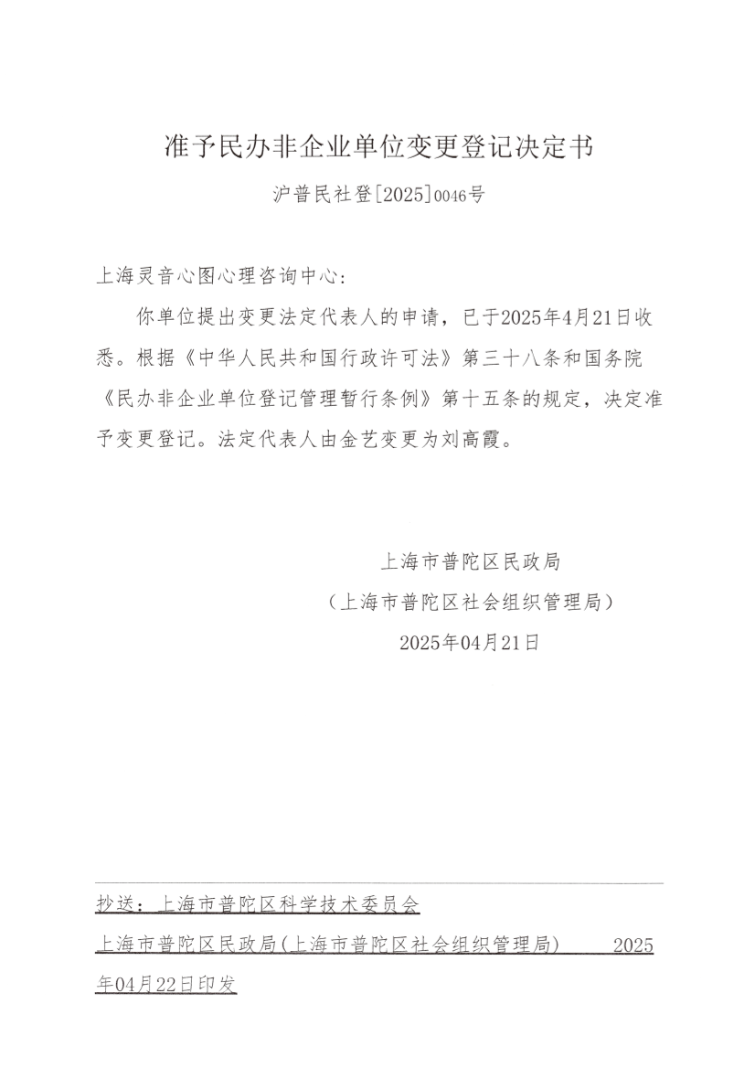 你单位提出变更法定代表人的申请,已于2025年4月21日收悉。根据《中华人民共和国行政许可法》第三十八条和国务院《民办非企业单位登记管理暂行条例》第十五条的规定,决定准予变更登记。法定代表人由金艺变更为刘高霞。