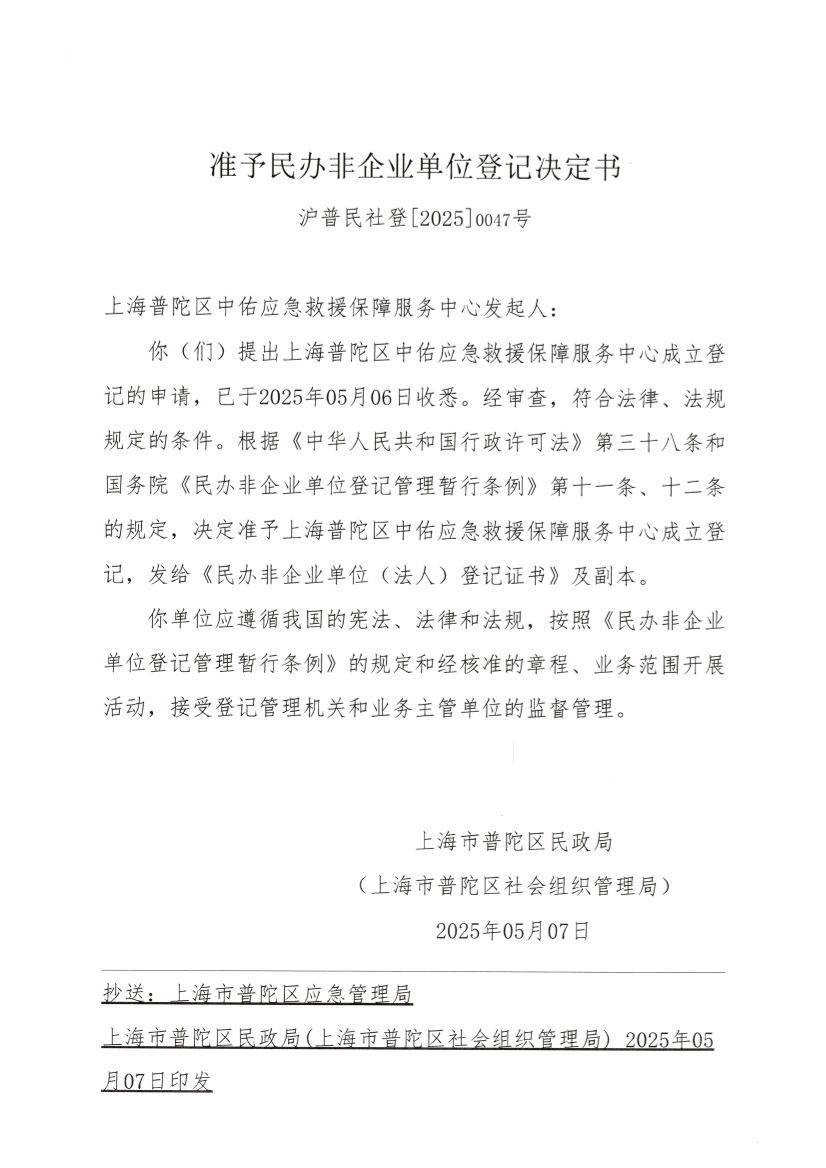 你(们)提出上海普陀区中佑应急救援保障服务中心成立登记的申请,已于2025年05月06日收悉。经审查,符合法律、法规规定的条件。根据《中华人民共和国行政许可法》第三十八条和国务院《民办非企业单位登记管理暂行条例》第十一条、十二条的规定,决定准予上海普陀区中佑应急救援保障服务中心成立登记,发给《民办非企业单位(法人)登记证书》及副本。