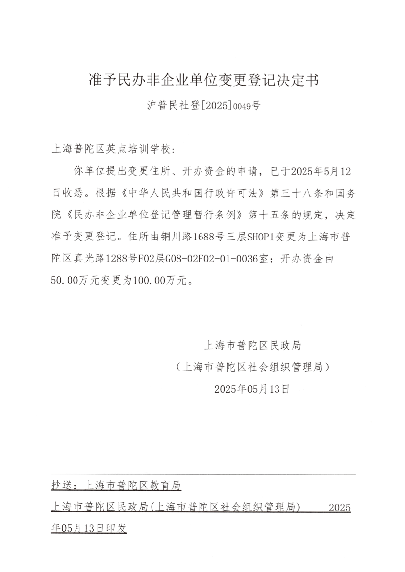 你单位提出变更住所、开办资金的申请,已于2025年5月12日收悉。根据《中华人民共和国行政许可法》第三十八条和国务院《民办非企业单位登记管理暂行条例》第十五条的规定,决定准予变更登记。住所由铜川路1688号三层SHOP1变更为上海市普陀区真光路1288号F02层G08-02F02-01-0036室;开办资金由50.00万元变更为100.00万元。