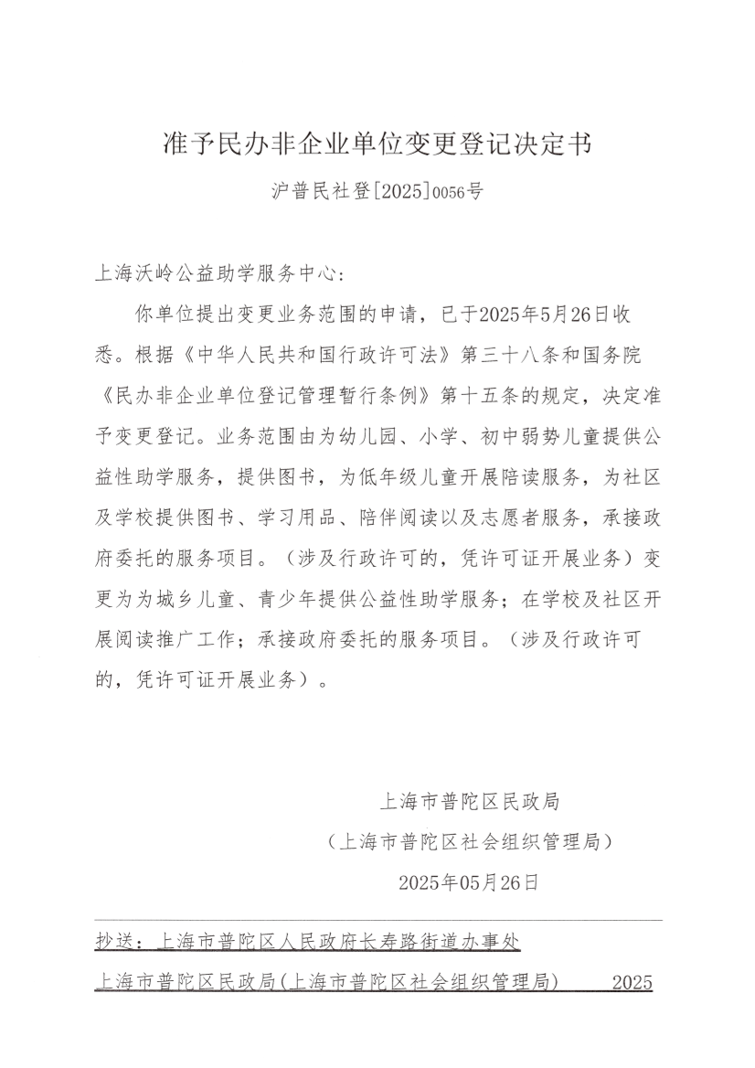 你单位提出变更业务范围的申请,已于2025年5月26日收悉。根据《中华人民共和国行政许可法》第三十八条和国务院《民办非企业单位登记管理暂行条例》第十五条的规定,决定准予变更登记。业务范围由为幼儿园、小学、初中弱势儿童提供公益性助学服务,提供图书,为低年级儿童开展陪读服务,为社区及学校提供图书、学习用品、陪伴阅读以及志愿者服务,承接政府委托的服务项目。(涉及行政许可的,凭许可证开展业务)变更为为城乡儿童、青少年提供公益性助学服务;在学校及社区开展阅读推广工作;承接政府委托的服务项目。(涉及行政许可的,凭许可证开展业务)。