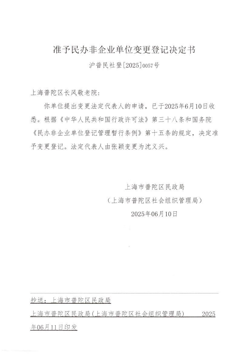 你单位提出变更法定代表人的申请,已于2025年6月10日收悉。根据《中华人民共和国行政许可法》第三十八条和国务院《民办非企业单位登记管理暂行条例》第十五条的规定,决定准予变更登记。法定代表人由张颖变更为沈义兴。
