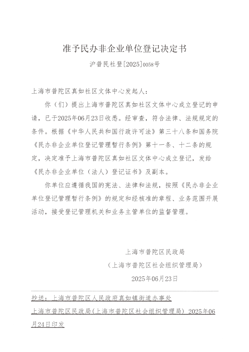 你(们)提出上海市普陀区真如社区文体中心成立登记的申请,已于2025年06月23日收悉。经审查,符合法律、法规规定的条件。根据《中华人民共和国行政许可法》第三十八条和国务院《民办非企业单位登记管理暂行条例》第十一条、十二条的规定,决定准予上海市普陀区真如社区文体中心成立登记,发给《民办非企业单位(法人)登记证书》及副本。
