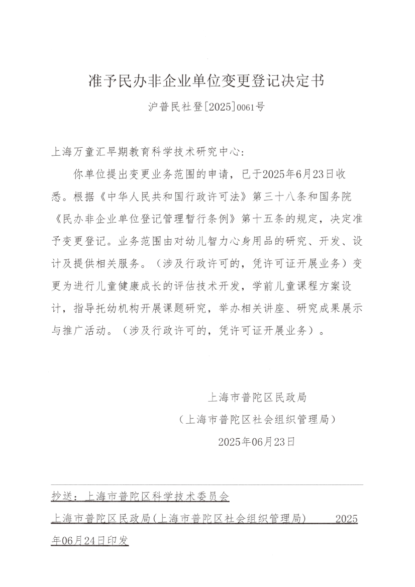 你单位提出变更业务范围的申请,已于2025年6月23日收悉。根据《中华人民共和国行政许可法》第三十八条和国务院《民办非企业单位登记管理暂行条例》第十五条的规定,决定准予变更登记。业务范围由对幼儿智力心身用品的研究、开发、设计及提供相关服务。(涉及行政许可的,凭许可证开展业务)变更为进行儿童健康成长的评估技术开发,学前儿童课程方案设计,指导托幼机构开展课题研究,举办相关讲座、研究成果展示与推广活动。(涉及行政许可的,凭许可证开展业务)。