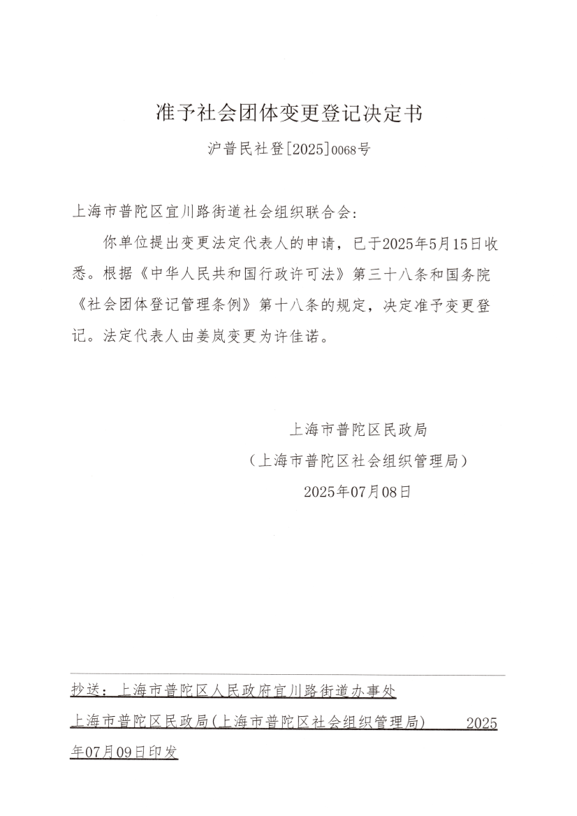 你单位提出变更法定代表人的申请,已于2025年5月15日收悉。根据《中华人民共和国行政许可法》第三十八条和国务院《社会团体登记管理条例》第十八条的规定,决定准予变更登记。法定代表人由姜岚变更为许佳诺。