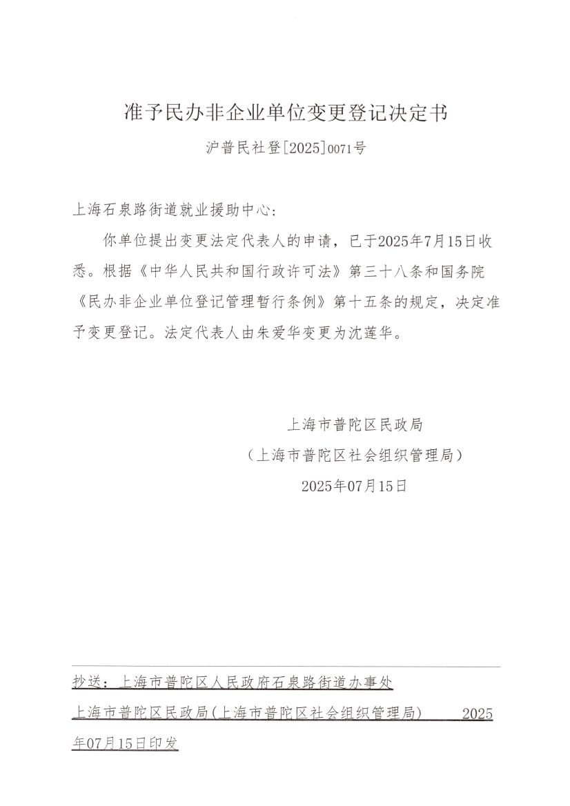 你单位提出变更法定代表人的申请,已于2025年7月15日收悉。根据《中华人民共和国行政许可法》第三十八条和国务院《民办非企业单位登记管理暂行条例》第十五条的规定,决定准予变更登记。法定代表人由朱爱华变更为沈莲华。