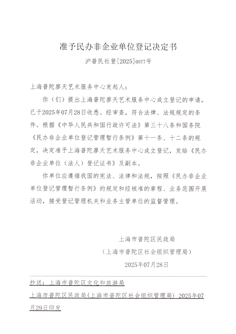 你(们)提出上海普陀廖天艺术服务中心成立登记的申请,已于2025年07月28日收悉。经审查,符合法律、法规规定的条件。根据《中华人民共和国行政许可法》第三十八条和国务院《民办非企业单位登记管理暂行条例》第十一条、十二条的规定,决定准予上海普陀廖天艺术服务中心成立登记,发给《民办非企业单位(法人)登记证书》及副本。