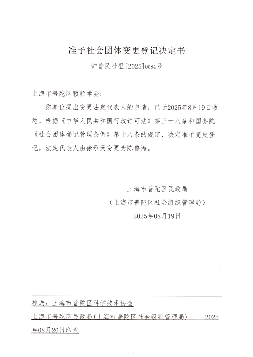 你单位提出变更法定代表人的申请,已于2025年8月19日收悉。根据《中华人民共和国行政许可法》第三十八条和国务院《社会团体登记管理条例》第十八条的规定,决定准予变更登记。法定代表人由徐承天变更为陈鲁海。
