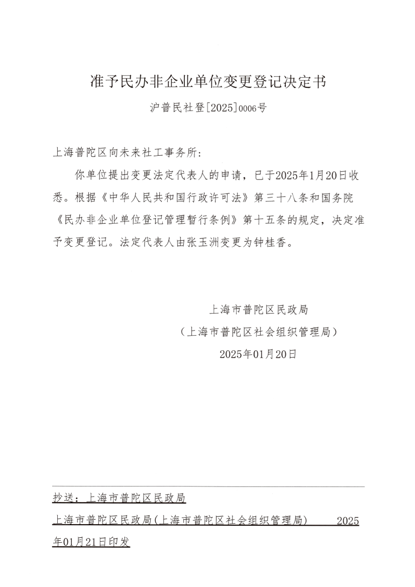 你单位提出变更法定代表人的申请,已于2025年1月20日收悉。根据《中华人民共和国行政许可法》第三十八条和国务院《民办非企业单位登记管理暂行条例》第十五条的规定,决定准予变更登记。法定代表人由张玉洲变更为钟桂香。
