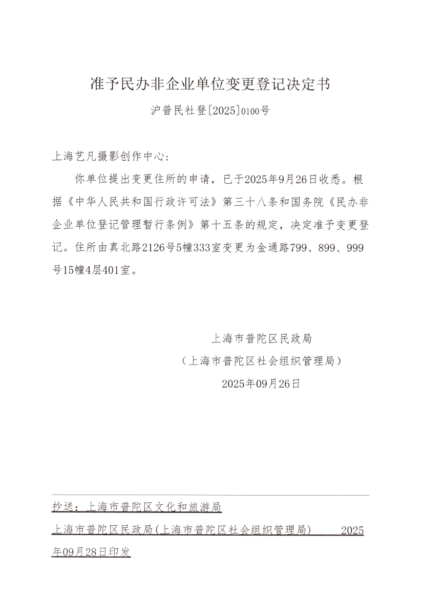 你单位提出变更住所的申请,已于2025年9月26日收悉。根据《中华人民共和国行政许可法》第三十八条和国务院《民办非企业单位登记管理暂行条例》第十五条的规定,决定准予变更登记。住所由真北路2126号5幢333室变更为金通路799、899、999号15幢4层401室。
