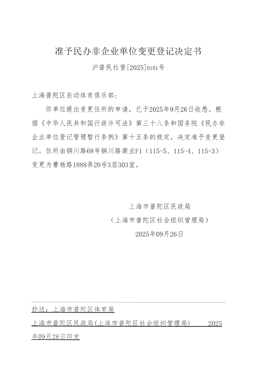 你单位提出变更住所的申请,已于2025年9月26日收悉。根据《中华人民共和国行政许可法》第三十八条和国务院《民办非企业单位登记管理暂行条例》第十五条的规定,决定准予变更登记。住所由铜川路68号铜川路商业F1(115-5、115-4、115-3)变更为曹杨路1888弄20号3层303室。