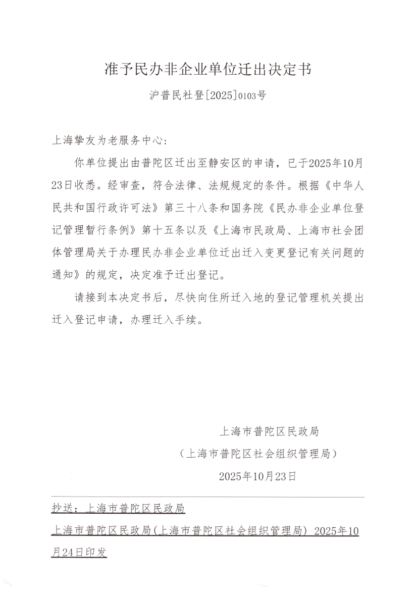 你单位提出由普陀区迁出至静安区的申请,已于2025年10月23日收悉。经审查,符合法律、法规规定的条件。根据《中华人民共和国行政许可法》第三十八条和国务院《民办非企业单位登记管理暂行条例》第十五条以及《上海市民政局、上海市社会团体管理局关于办理民办非企业单位迁出迁入变更登记有关问题的通知》的规定,决定准予迁出登记。