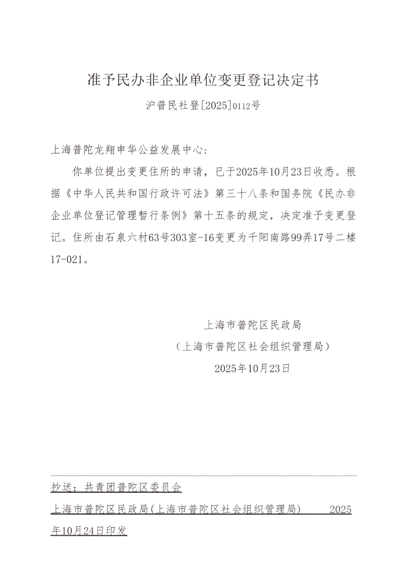你单位提出变更住所的申请,已于2025年10月23日收悉。根据《中华人民共和国行政许可法》第三十八条和国务院《民办非企业单位登记管理暂行条例》第十五条的规定,决定准予变更登记。住所由石泉六村63号303室-16变更为千阳南路99弄17号二楼17-021。