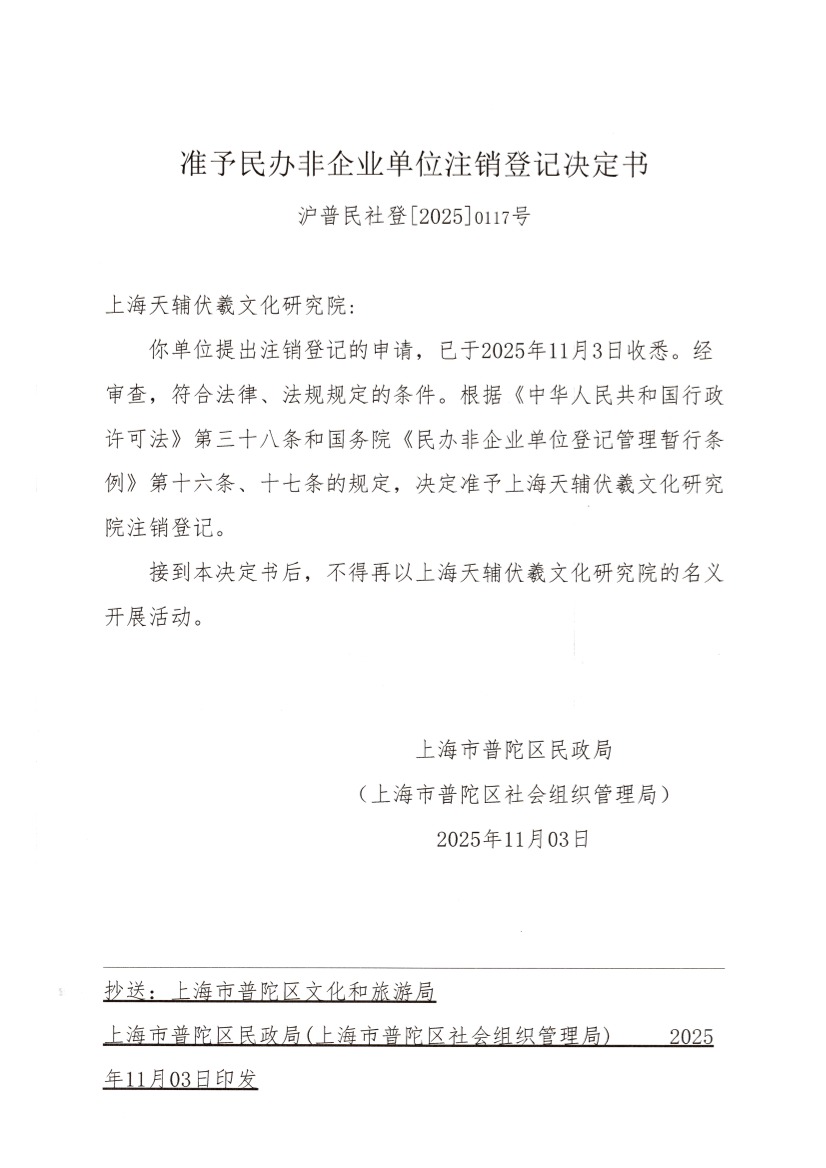 你单位提出注销登记的申请,已于2025年11月3日收悉。经审查,符合法律、法规规定的条件。根据《中华人民共和国行政许可法》第三十八条和国务院《民办非企业单位登记管理暂行条例》第十六条、十七条的规定,决定准予上海天辅伏羲文化研究院注销登记。