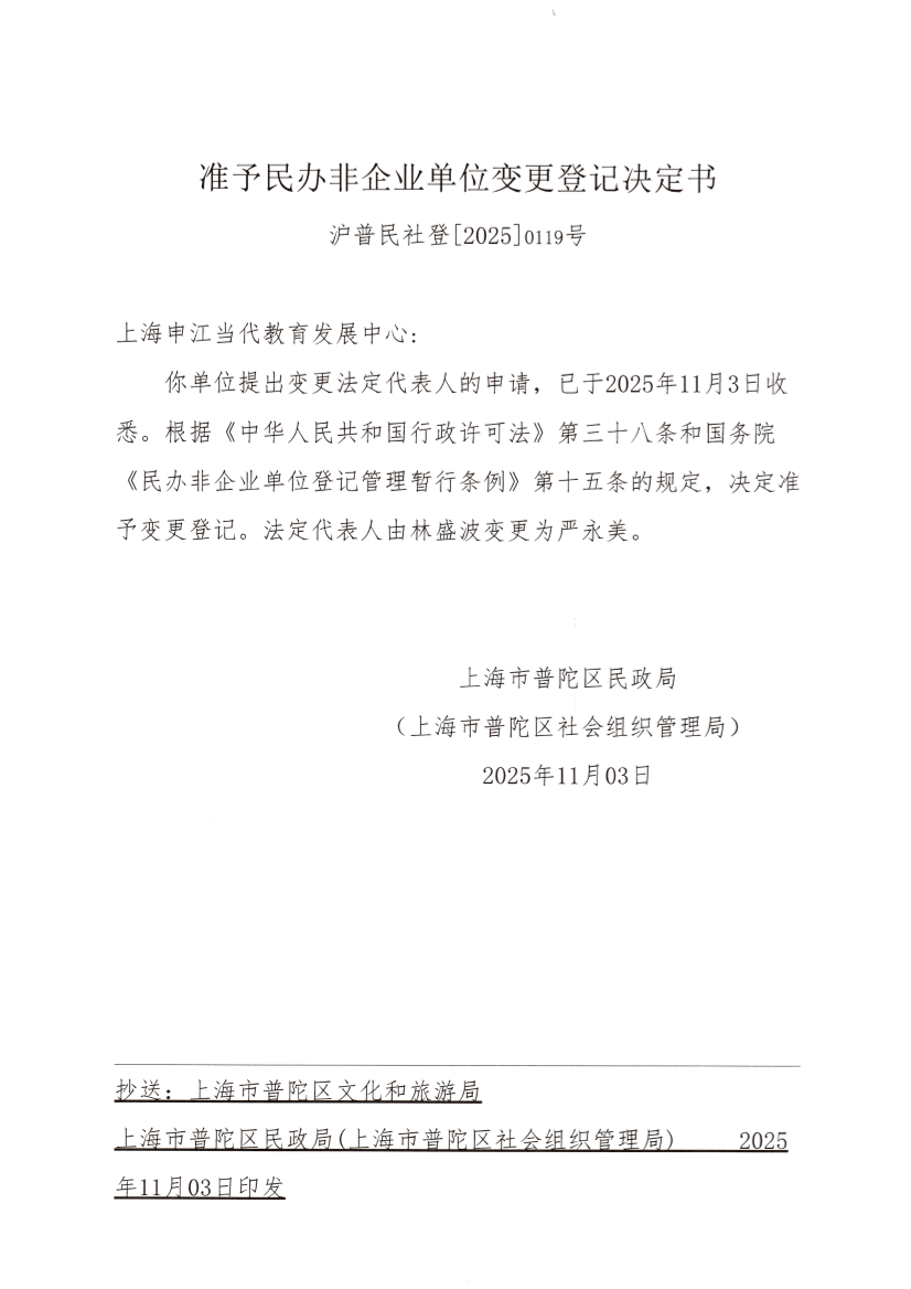 你单位提出变更法定代表人的申请,已于2025年11月3日收悉。根据《中华人民共和国行政许可法》第三十八条和国务院《民办非企业单位登记管理暂行条例》第十五条的规定,决定准予变更登记。法定代表人由林盛波变更为严永美。
