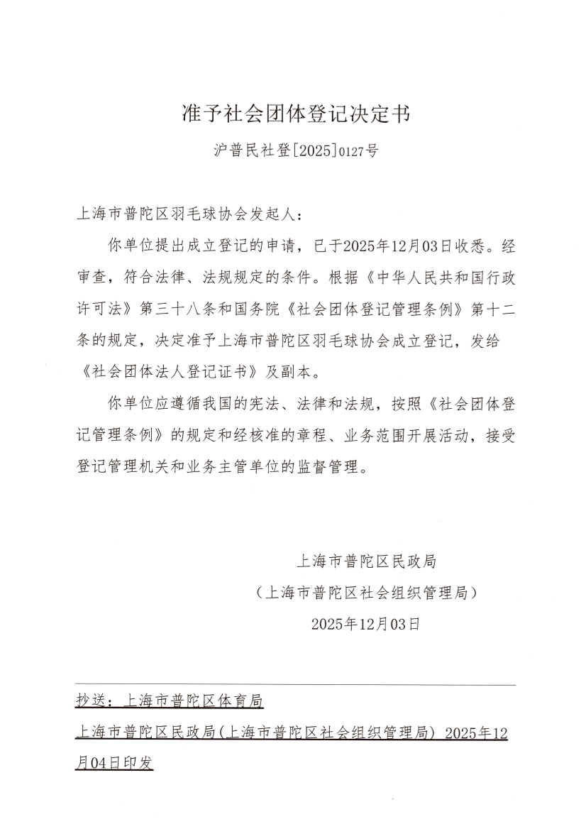 你单位提出成立登记的申请,已于2025年12月03日收悉。经审查,符合法律、法规规定的条件。根据《中华人民共和国行政许可法》第三十八条和国务院《社会团体登记管理条例》第十二条的规定,决定准予上海市普陀区羽毛球协会成立登记,发给《社会团体法人登记证书》及副本。