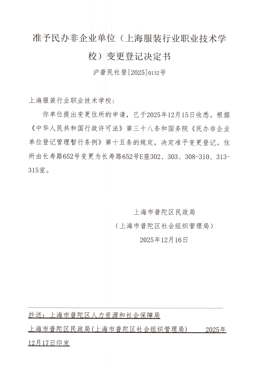 你单位提出变更住所的申请,已于2025年12月15日收悉。根据《中华人民共和国行政许可法》第三十八条和国务院《民办非企业单位登记管理暂行条例》第十五条的规定,决定准予变更登记。住所由长寿路652号变更为长寿路652号E座302、303、308-310、313-315室。