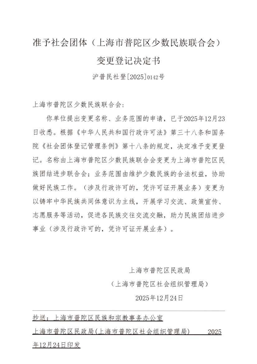 你单位提出变更名称、业务范围的申请,已于2025年12月23日收悉。根据《中华人民共和国行政许可法》第三十八条和国务院《社会团体登记管理条例》第十八条的规定,决定准予变更登记。名称由上海市普陀区少数民族联合会变更为上海市普陀区民族团结进步联合会;业务范围由维护少数民族的合法权益,协助做好民族工作。(涉及行政许可的,凭许可证开展业务)变更为以铸牢中华民族共同体意识为主线,开展学习交流、政策宣传、志愿服务等活动,促进各民族交往交流交融,助力民族团结进步事业(涉及行政许可的,凭许可证开展业务)。