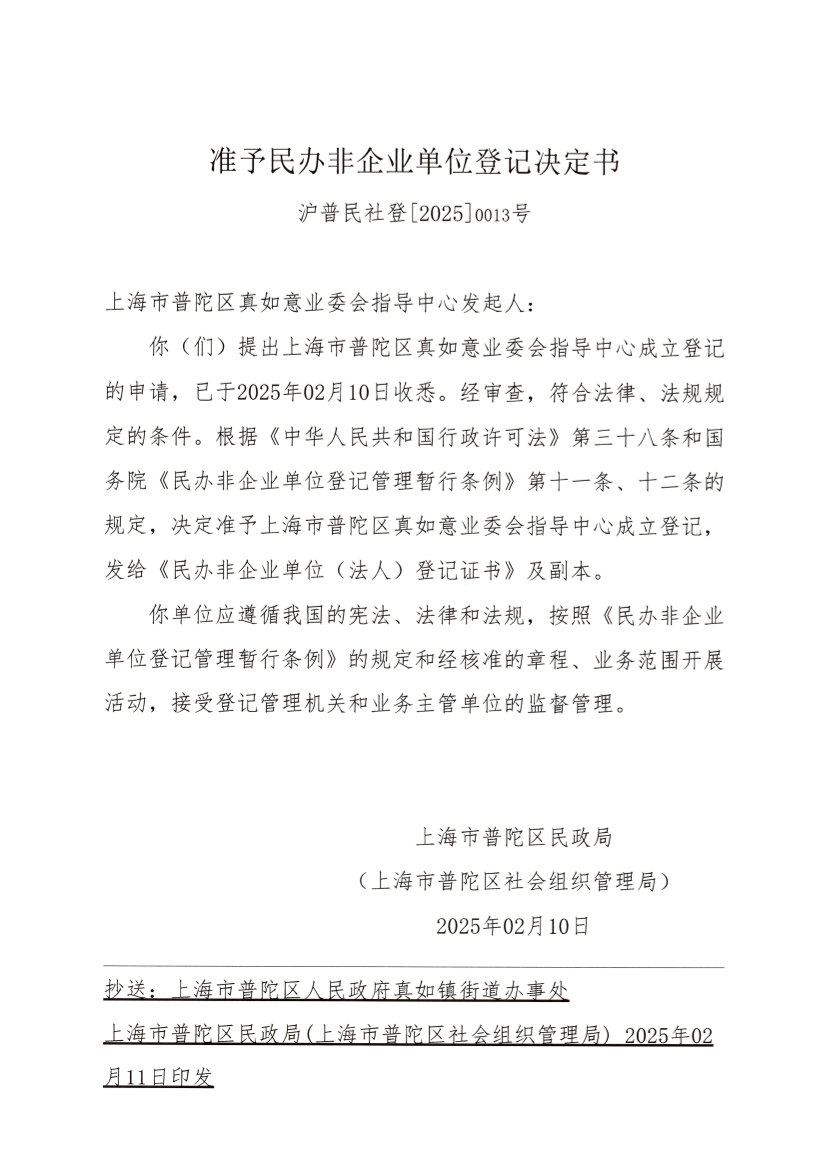 你(们)提出上海市普陀区真如意业委会指导中心成立登记的申请,已于2025年02月10日收悉。经审查,符合法律、法规规定的条件。根据《中华人民共和国行政许可法》第三十八条和国务院《民办非企业单位登记管理暂行条例》第十一条、十二条的规定,决定准予上海市普陀区真如意业委会指导中心成立登记,发给《民办非企业单位(法人)登记证书》及副本。
