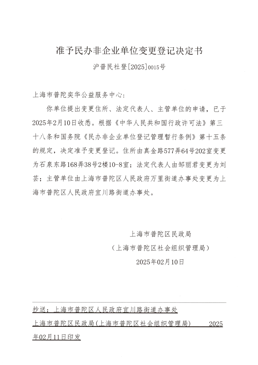 你单位提出变更住所、法定代表人、主管单位的申请,已于2025年2月10日收悉。根据《中华人民共和国行政许可法》第三十八条和国务院《民办非企业单位登记管理暂行条例》第十五条的规定,决定准予变更登记。住所由真金路577弄64号202室变更为石泉东路168弄38号2楼10-8室;法定代表人由邹丽君变更为刘芸;主管单位由上海市普陀区人民政府万里街道办事处变更为上海市普陀区人民政府宜川路街道办事处。