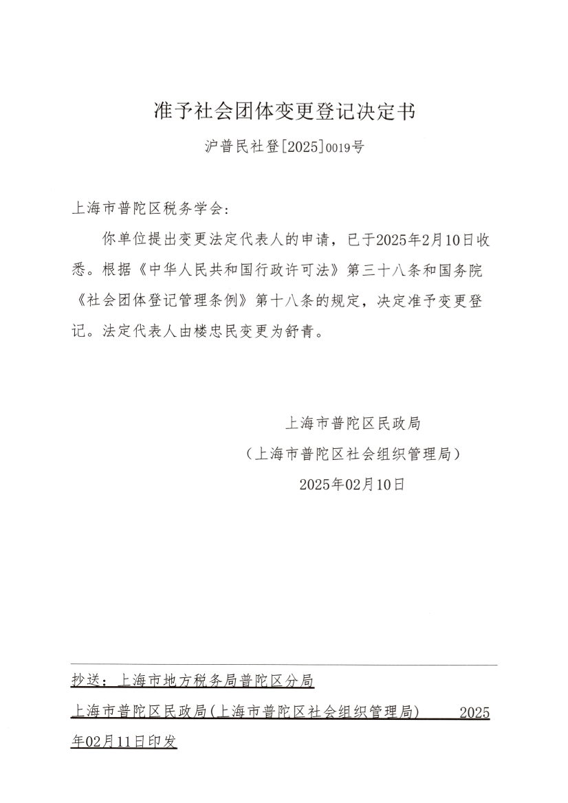 你单位提出变更法定代表人的申请,已于2025年2月10日收悉。根据《中华人民共和国行政许可法》第三十八条和国务院《社会团体登记管理条例》第十八条的规定,决定准予变更登记。法定代表人由楼忠民变更为舒青。