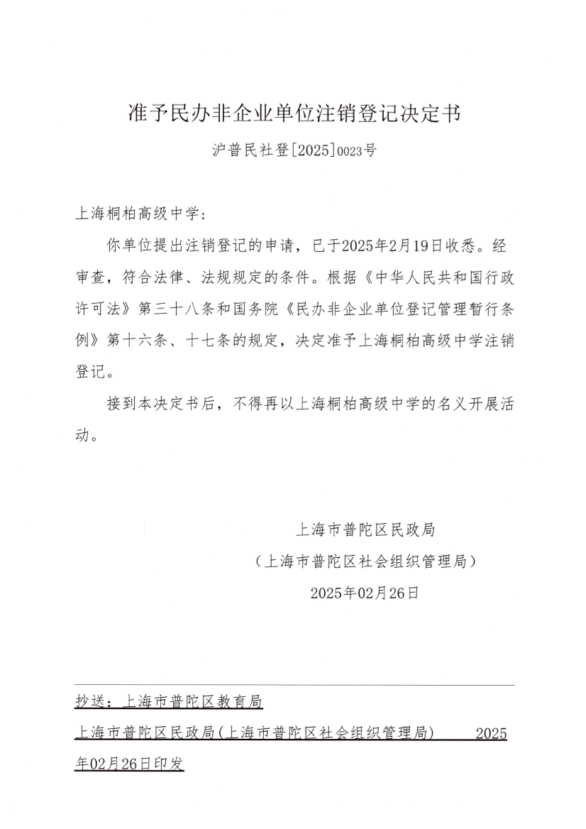 你单位提出注销登记的申请,已于2025年2月19日收悉。经审查,符合法律、法规规定的条件。根据《中华人民共和国行政许可法》第三十八条和国务院《民办非企业单位登记管理暂行条例》第十六条、十七条的规定,决定准予上海桐柏高级中学注销登记。
