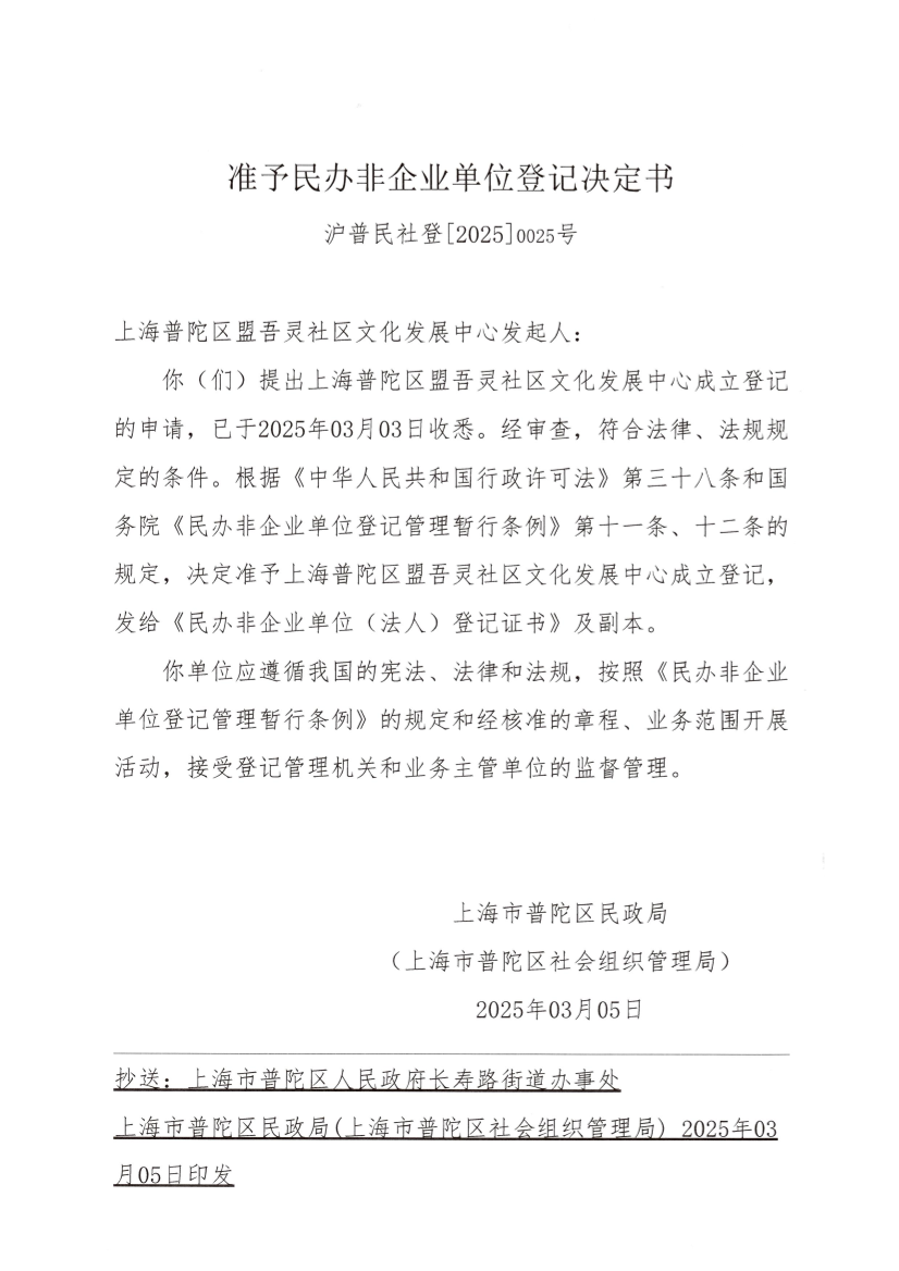 你(们)提出上海普陀区盟吾灵社区文化发展中心成立登记的申请,已于2025年03月03日收悉。经审查,符合法律、法规规定的条件。根据《中华人民共和国行政许可法》第三十八条和国务院《民办非企业单位登记管理暂行条例》第十一条、十二条的规定,决定准予上海普陀区盟吾灵社区文化发展中心成立登记,发给《民办非企业单位(法人)登记证书》及副本。