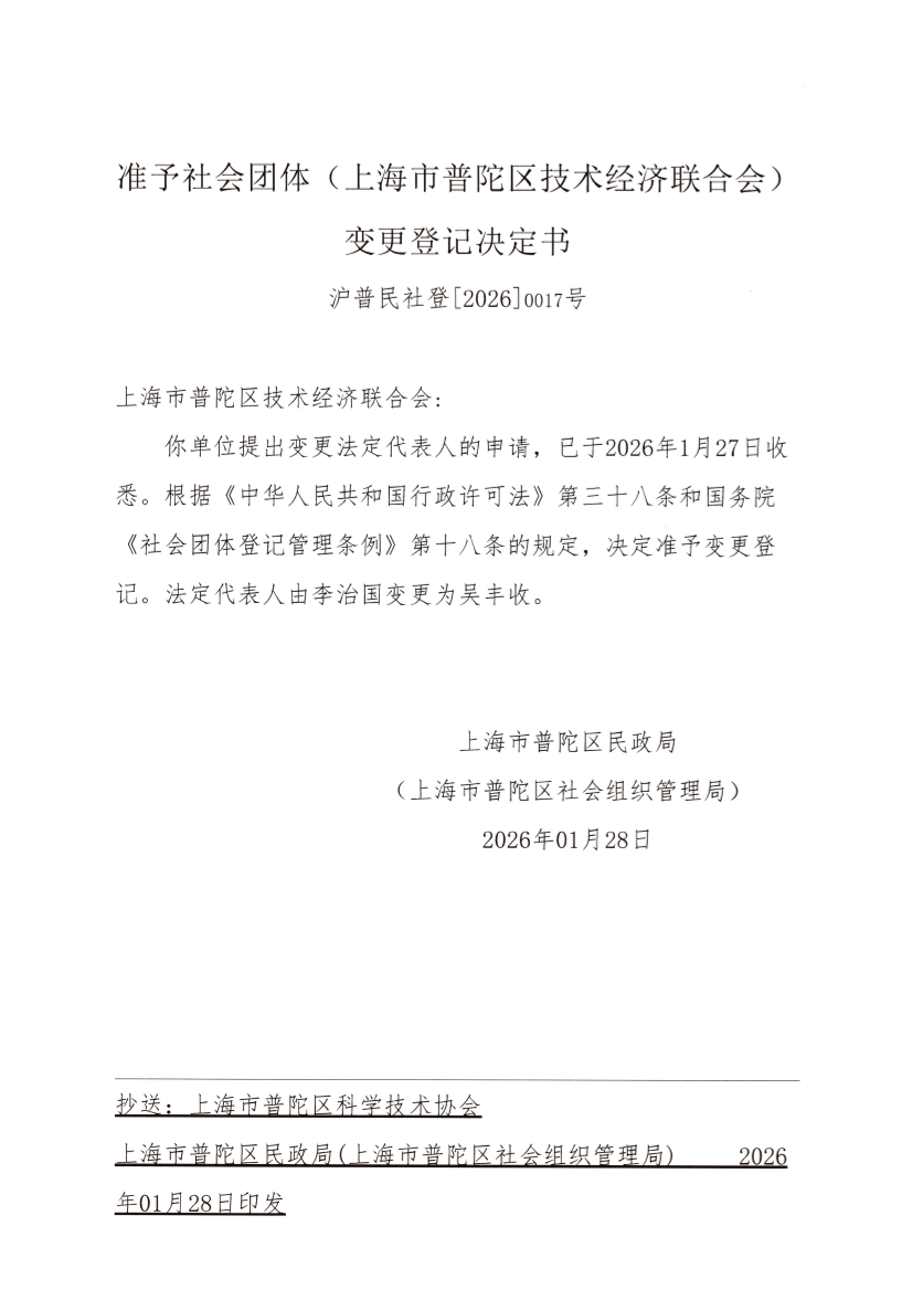你单位提出变更法定代表人的申请,已于2026年1月27日收悉。根据《中华人民共和国行政许可法》第三十八条和国务院《社会团体登记管理条例》第十八条的规定,决定准予变更登记。法定代表人由李治国变更为吴丰收。
