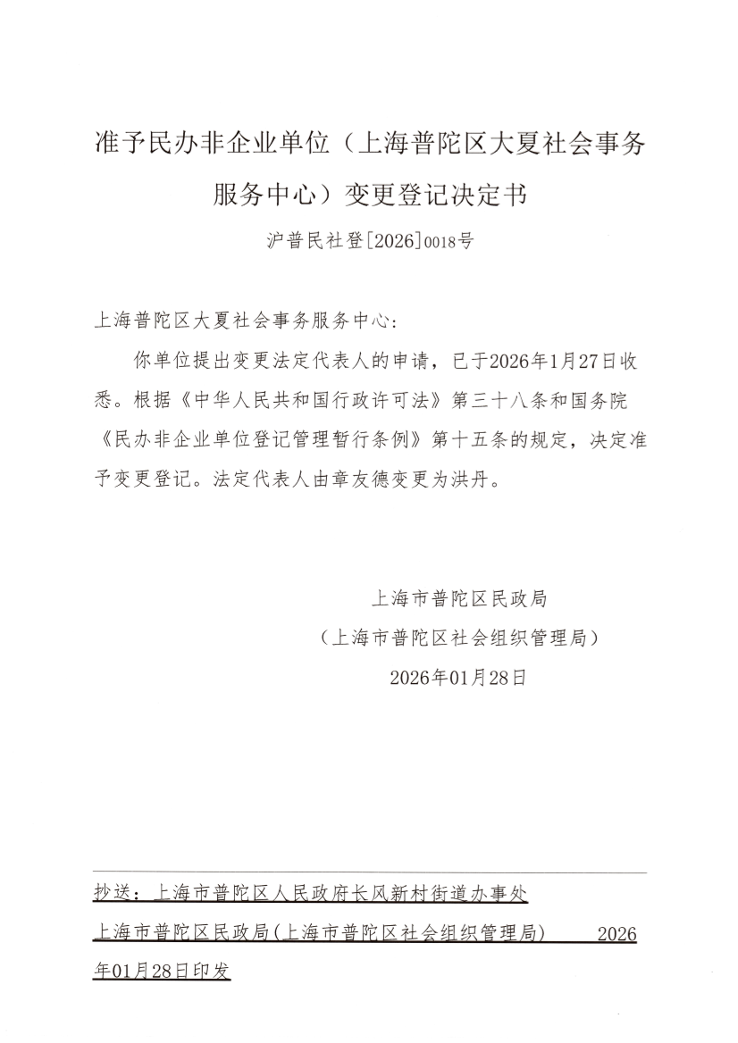 你单位提出变更法定代表人的申请,已于2026年1月27日收悉。根据《中华人民共和国行政许可法》第三十八条和国务院《民办非企业单位登记管理暂行条例》第十五条的规定,决定准予变更登记。法定代表人由章友德变更为洪丹。