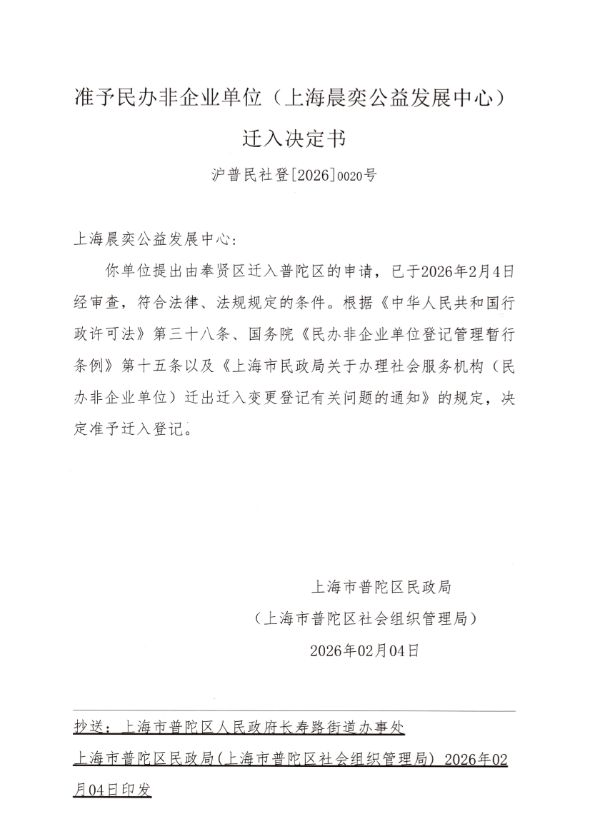 你单位提出由奉贤区迁入普陀区的申请,已于2026年2月4日经审查,符合法律、法规规定的条件。根据《中华人民共和国行政许可法》第三十八条、国务院《民办非企业单位登记管理暂行条例》第十五条以及《上海市民政局关于办理社会服务机构(民办非企业单位)迁出迁入变更登记有关问题的通知》的规定,决定准予迁入登记。